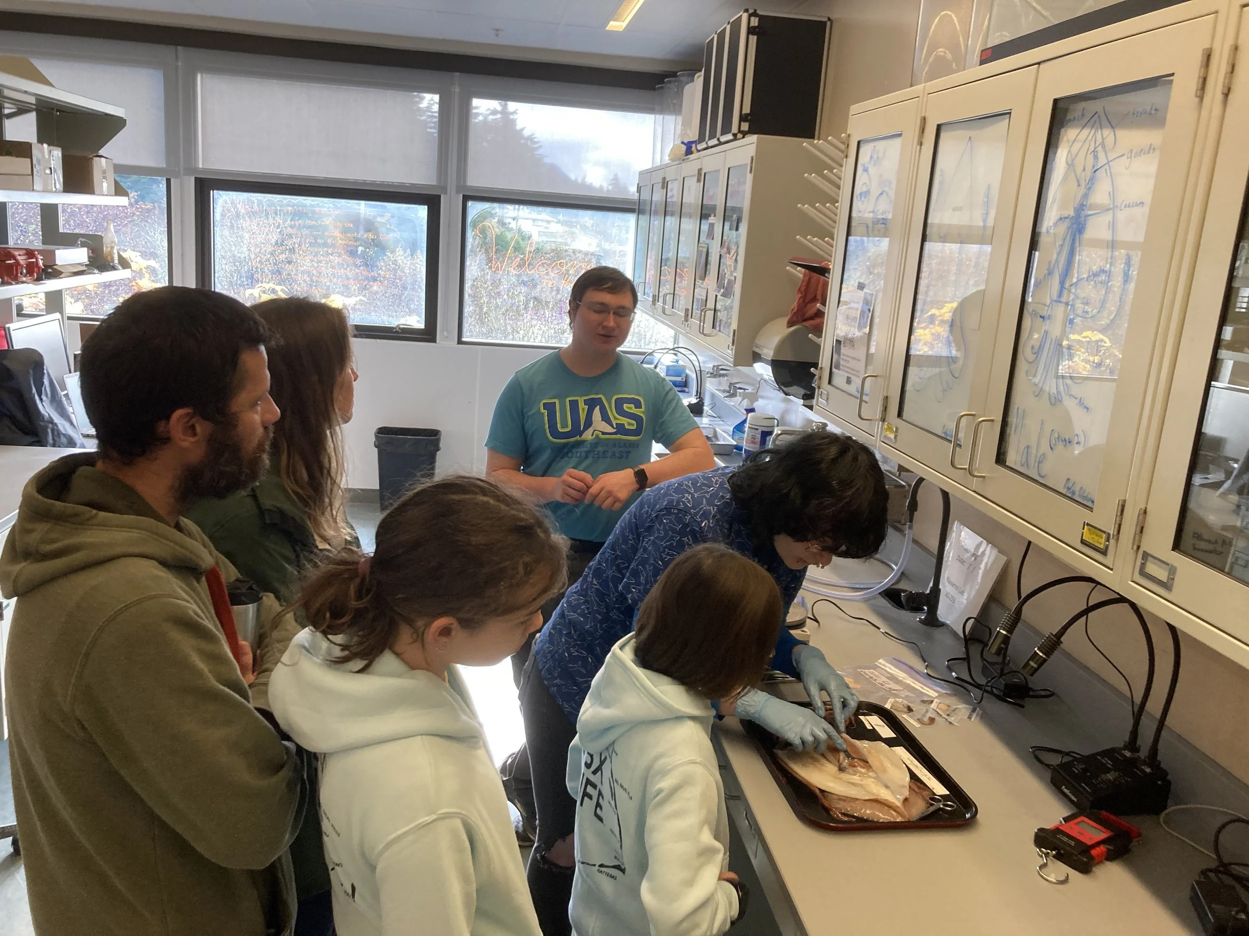 Undergraduates receive hands on training in community-relevant research while also engaging with the community. Student researchers Reese Tolbert and Ripley Wholecheese perform a dissection on the species, Berryteuthis magister, at the UAS Open House, 2025.